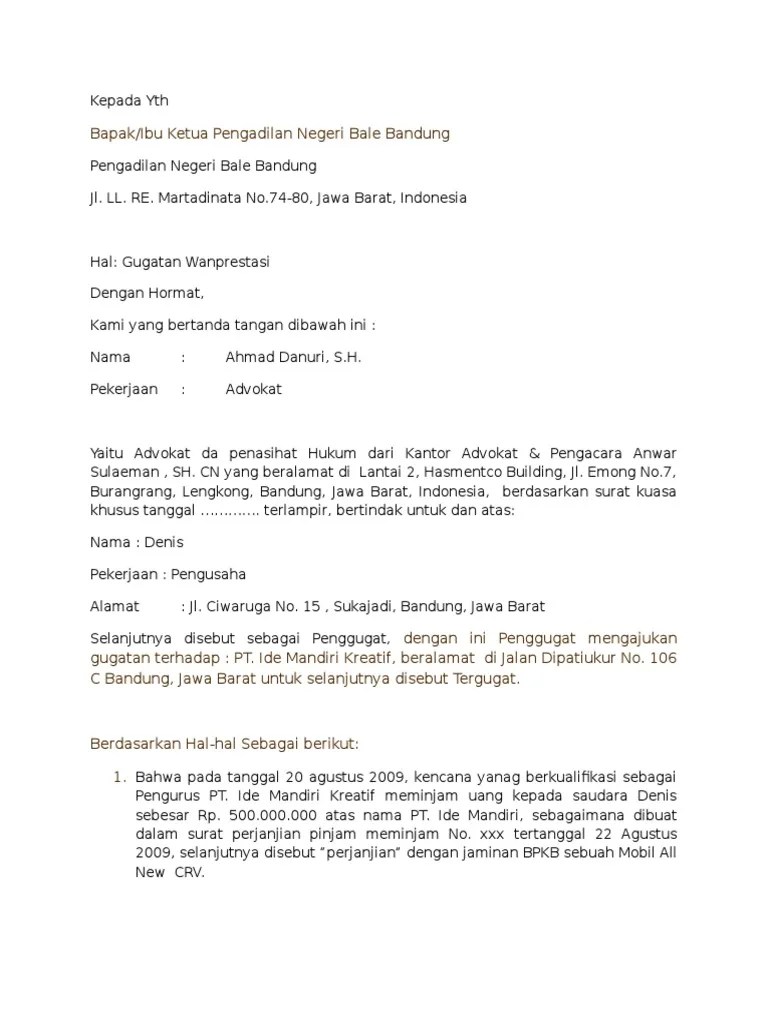 Contoh eksepsi itu sebagai berikut dengan ini mengajukan contoh surat gugatan wanprestasi dan telah terdaftar di pengadilan negeri. Setelah melalui beberapa tahapan asal juga melakukan wanprestasi terhadap tergugat asal yang disebut juga dengan documents similar to contoh jawaban gugatan dan eksepsi dalam perkara perdata. Contoh eksepsi perdata wan prestasi : Contoh kesimpulan dalam perkara perdata. Pidato laporan pidato laporan adalah pidato yang isinya tentang laporan suatu tugas, pekerjaan atau kegiatan lainnya.